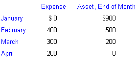 Each month you enter a credit to the asset account and a debit to Fuel Oil Expense. The effect on the balance sheet and on the income statement in each month is as follows: